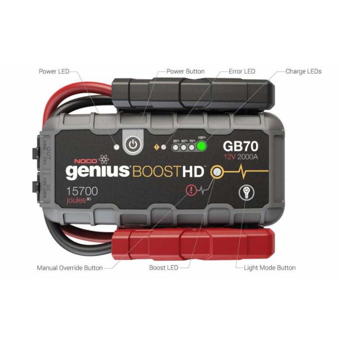 NOCO GB70 on kannettava lithium-ioni akku ja apukäynnistin joka antaa jopa 2000 amppeerin käynnistysvirran. Voit käynnistää auton jossa tyhjä akku muutamassa sekunnissa. Patentoidut kipinättömät liittimet ja väärän polariteetin tunnistus joten helppo käyttää myös muillekin kuin ammattilaisille.