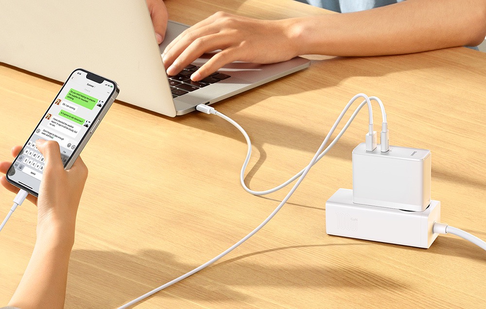 Laturissa on 2 porttia - USB-A ja USB-C. Se tukee PD-, QC- ja PPS-pikalatausprotokollia. Se voi ladata 100 watin teholla käyttämällä vain USB-C-porttia, 60 wattia USB-A-portin kautta. 65 wattia ja 30 wattia, kun lataat 2 laitetta kerralla. Se on yhteensopiva Android-, iOS-, macOS- tai Windows-pohjaisten kannettavien tietokoneiden, tablettien ja älypuhelimien kanssa, jotka tukevat pikalatausprotokollia.