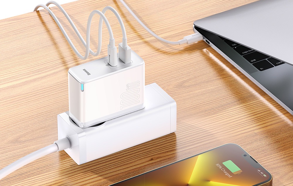 Baseus GaN5 Pro USB-C + USB-verkkolaturi, 100W +1m kaapeli (valkoinen)