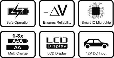 - BACKLIT LCD-näyttö, jossa akun latausilmaisin erikseen jokaiselle latauspaikalle latauksen aikana, se näyttää nykyisen lataustason (vastaa 25/50/75/100%) pylväskaaviossa yksinkertaisella ja luettavalla tavalla.