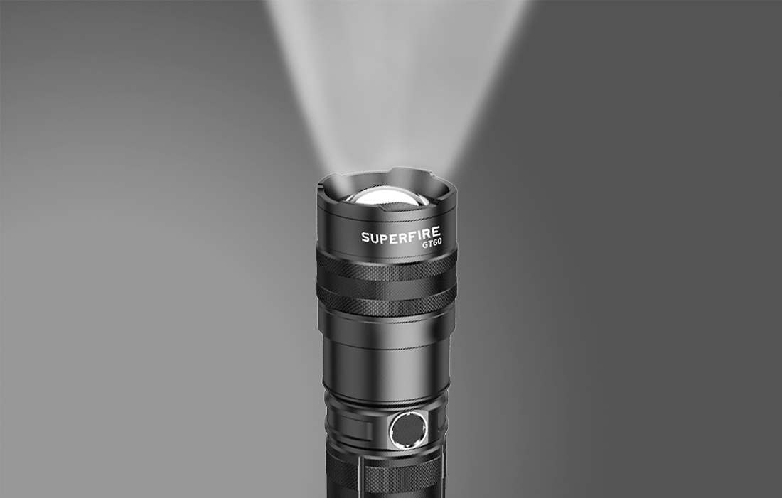 GT60:ssä on 2600 lumenia ja P90-siru.. Siinä on 2 tilaa: fokusoitu ja hajavalo, jota voit käyttää tarpeidesi mukaan.