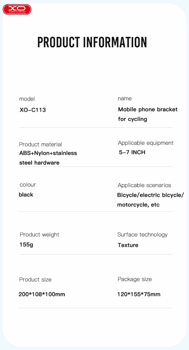 XO C113 on yleiskäyttöinen älypuhelinteline ohjaustankoon kiinnityksellä, joka sopii polkupyörille ja moottoripyörille. Erityinen rakenne pitää älypuhelimen turvallisesti vakaassa asennossa.